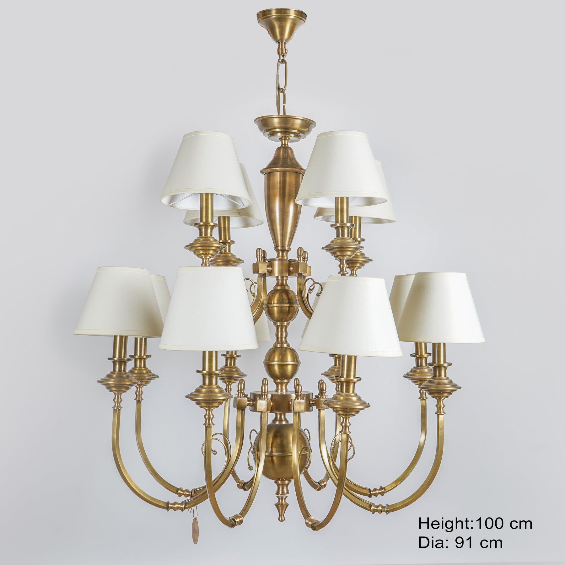 This exquisite chandelier exudes timeless charm, effortlessly transforming any professional space into a luxurious haven. With its flawless antique finish and delicate off-white fabric shades, it radiates an aura of refined beauty that is sure to captivate all who enter. Illuminate your professional realm with confidence and style, as this impressive centerpiece commands attention and leaves a lasting impression on clients and colleagues alike. Elevate your surroundings to new heights of grandeur with the Elena 8+4 Lights Brass Chandelier – a true masterpiece designed for professionals who value excellence.