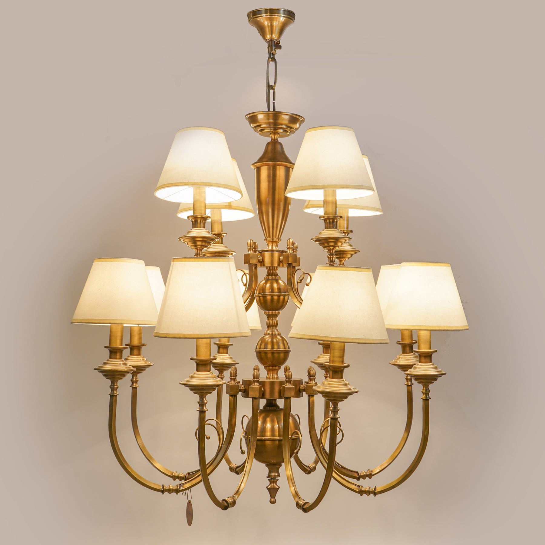 ELENA 8+4 Lights Brass Chandelier in Antique Finish With Off-White Gabric Shades