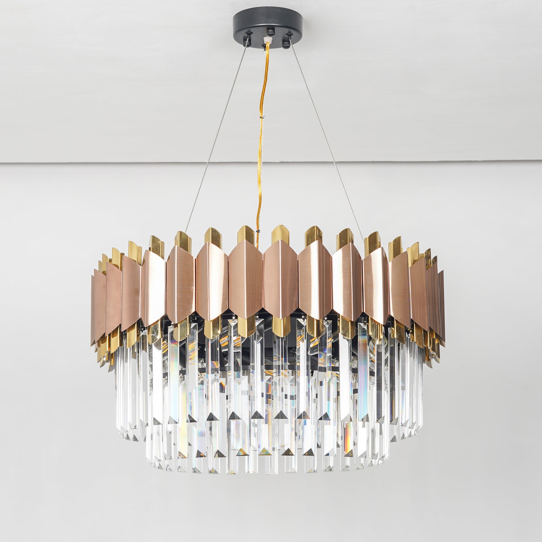 The chandelier showcases a refined color combination of Brass, Copper, and Clear Crystal, making it a perfect centerpiece for living rooms, dining areas, bedrooms, lobbies, or premium hospitality spaces. Its intricate crystal detailing beautifully reflects light, adding a sense of sophistication and grandeur to any décor style—from classic to contemporary.