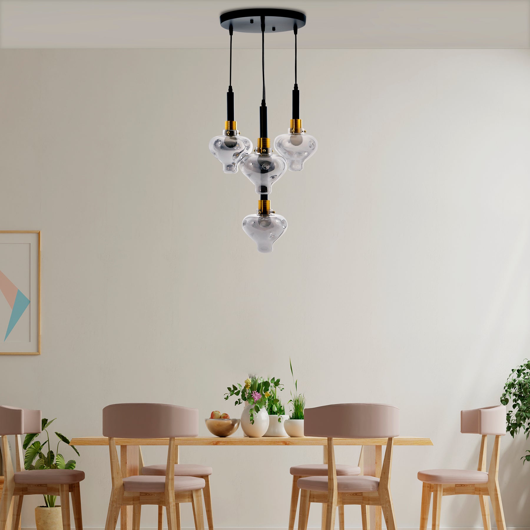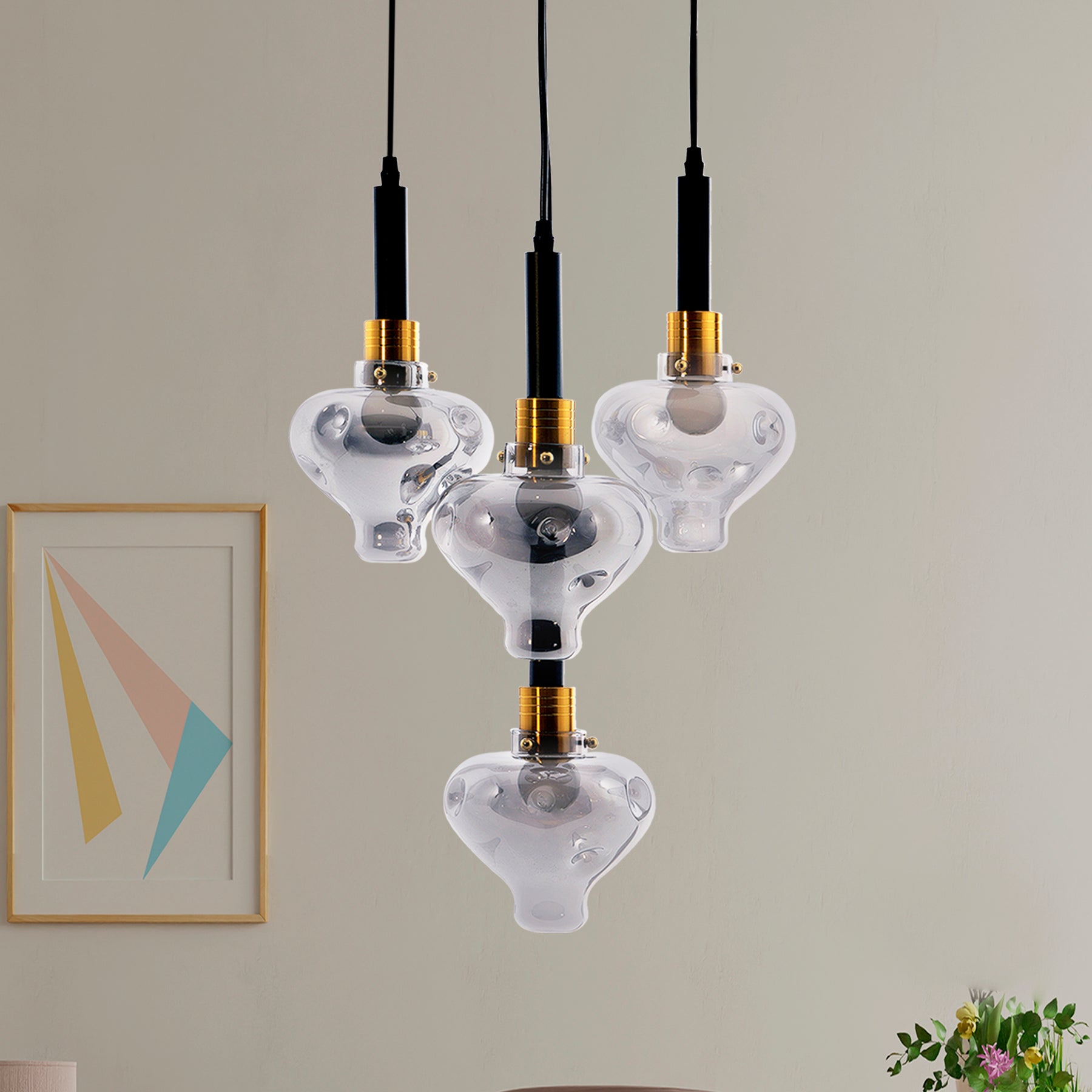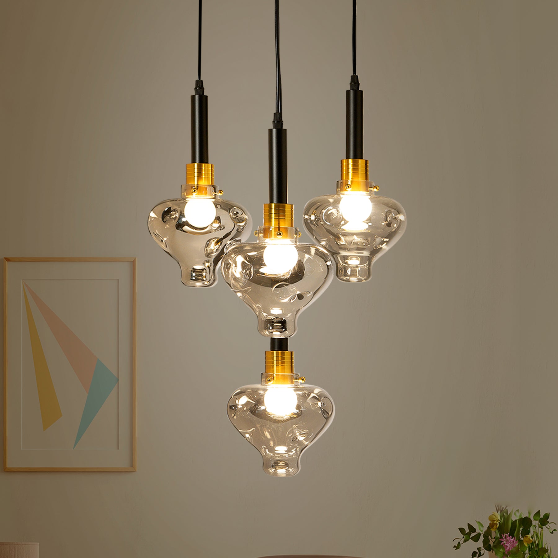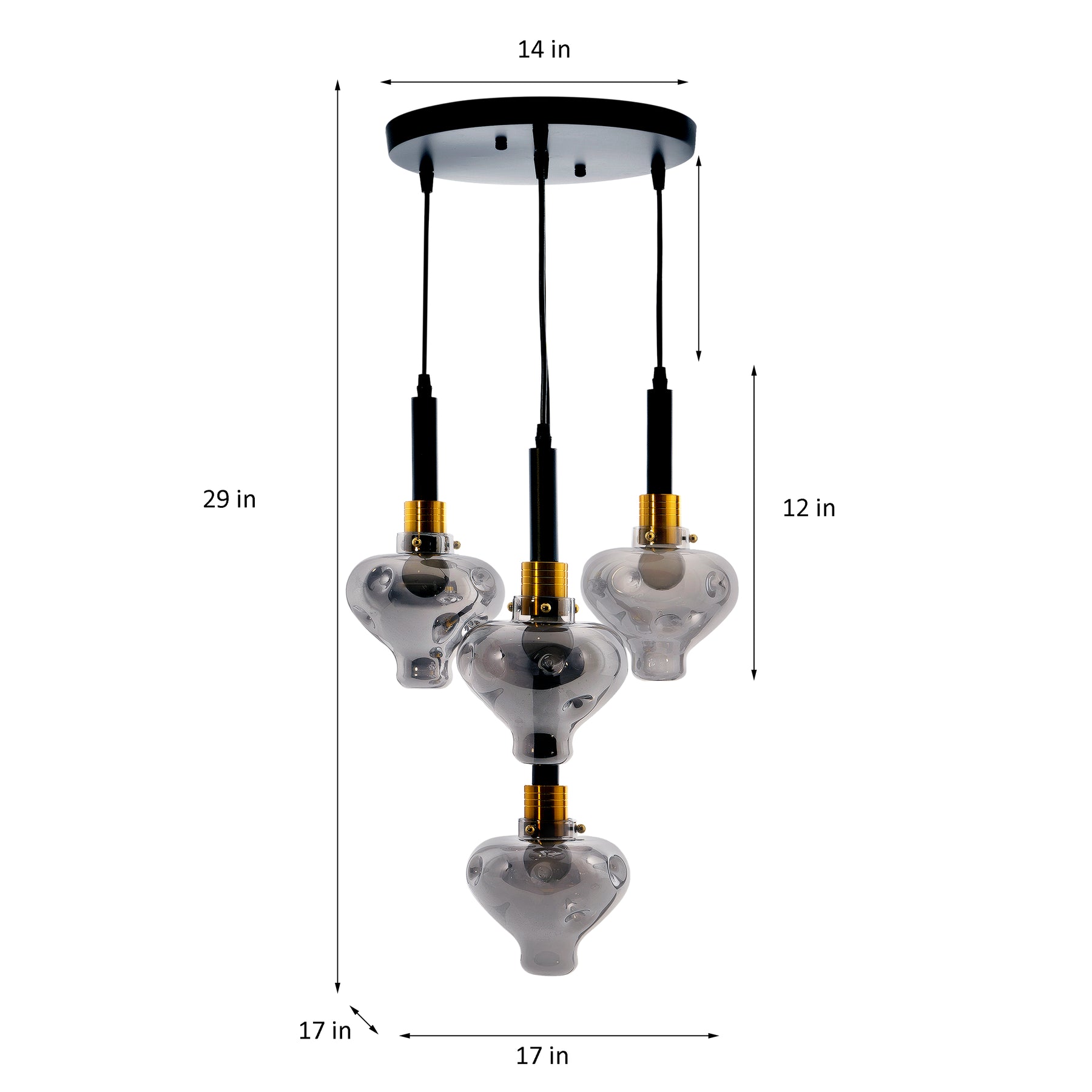 Create a decorative display above the dining table or kitchen island with the cluster pendant. Made from metal & Glass, this 4-light pendant features teardrop shaped shades that hang at different lengths for a waterfall effect. This pendant's Glass shades will direct the light downward into your space.