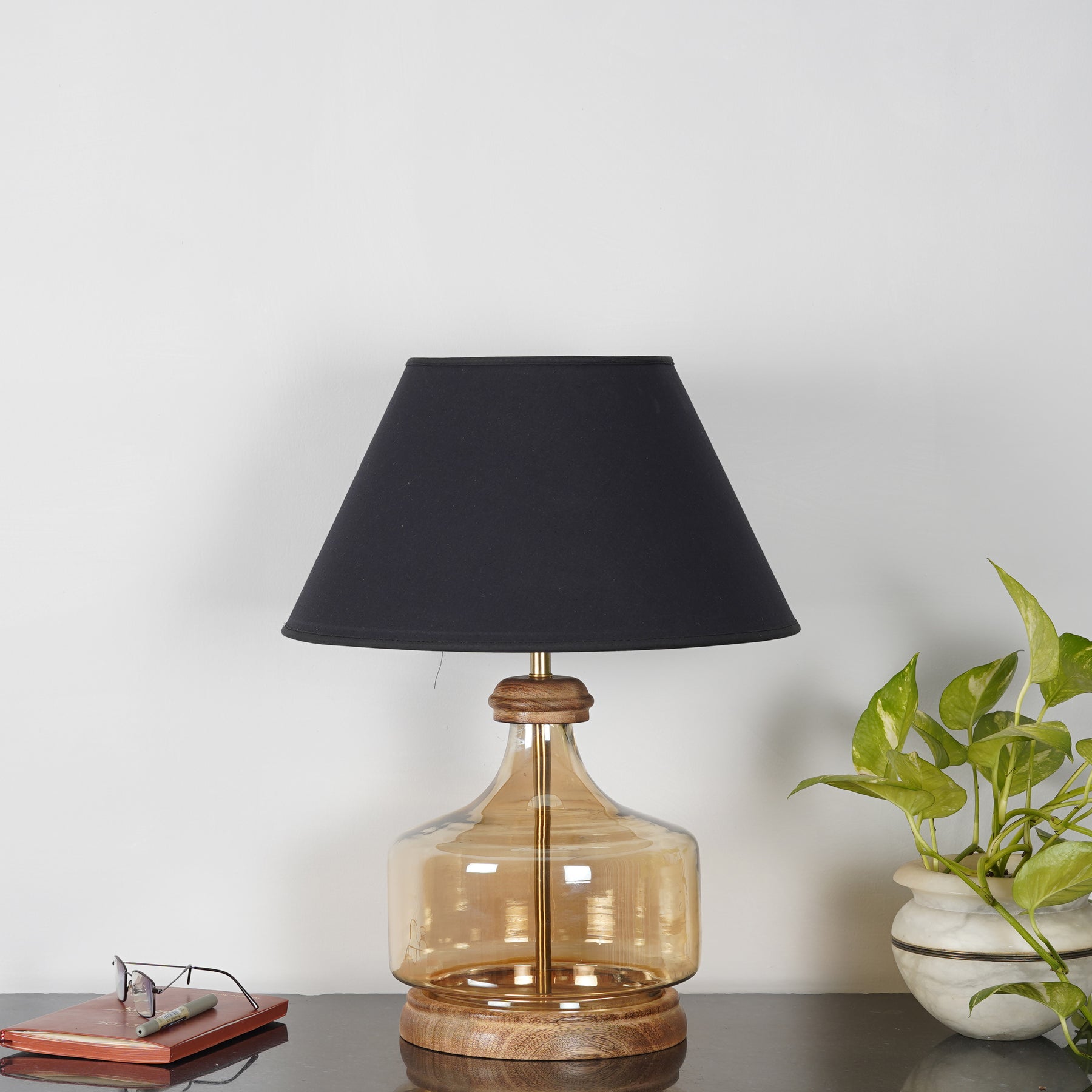 Alexandro Amber Luster Glass and Wood Table Lamp With Cotton Shade features a mid-century modern inspired design. The lamp shade has a simple round design that gives the table lamp a casual feel. The simple lines, combined with the transparent luster glass base, create an airy look, and the luster finish adds a subtle touch of color and elegance to your entryway table, side table or nightstand.