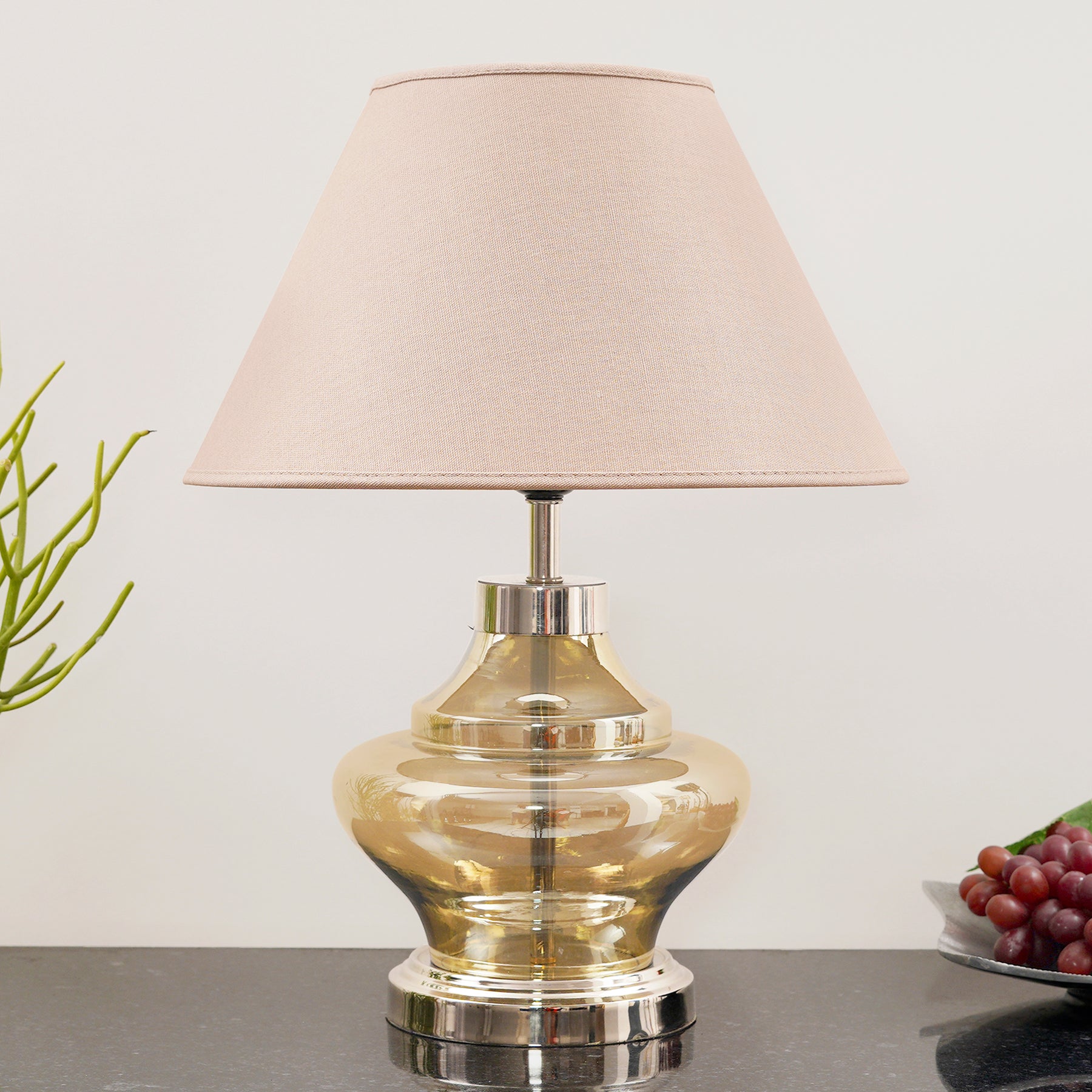 The glass side table lamp features a mid-century modern inspired design. The lamp shade has a simple round design that gives the table lamp a casual feel. The simple lines, combined with the smoke luster glass base, and the luster finish adds a subtle touch of color and elegance to your entryway table, side table or nightstand.