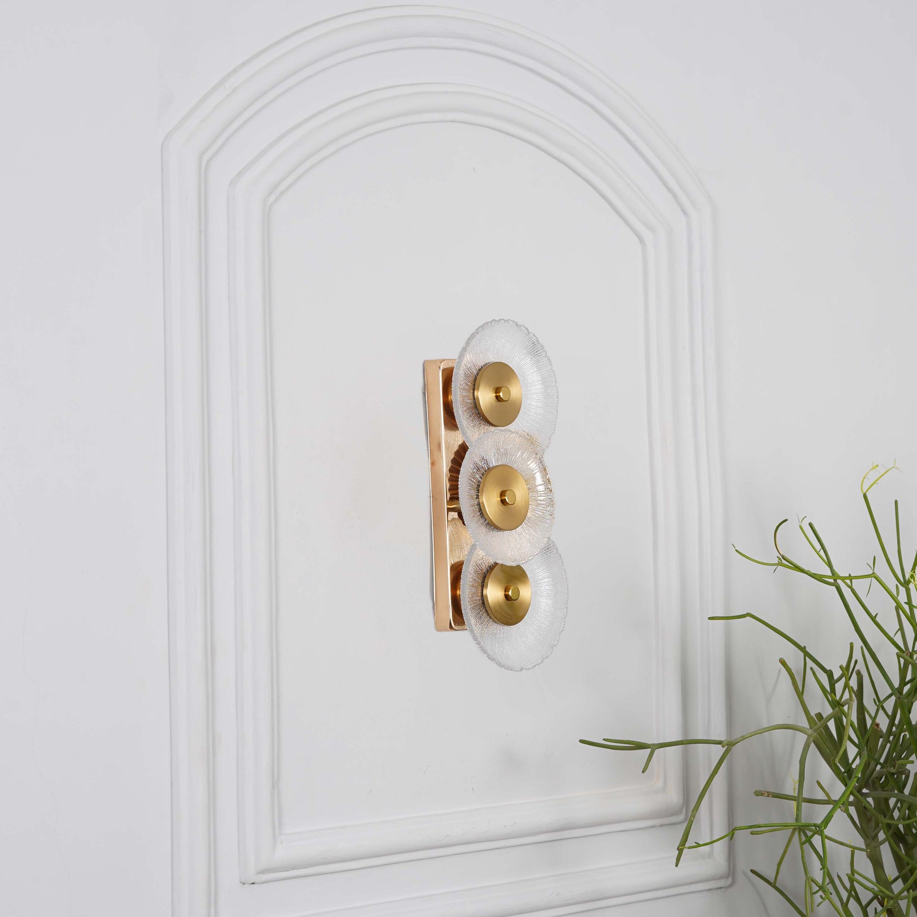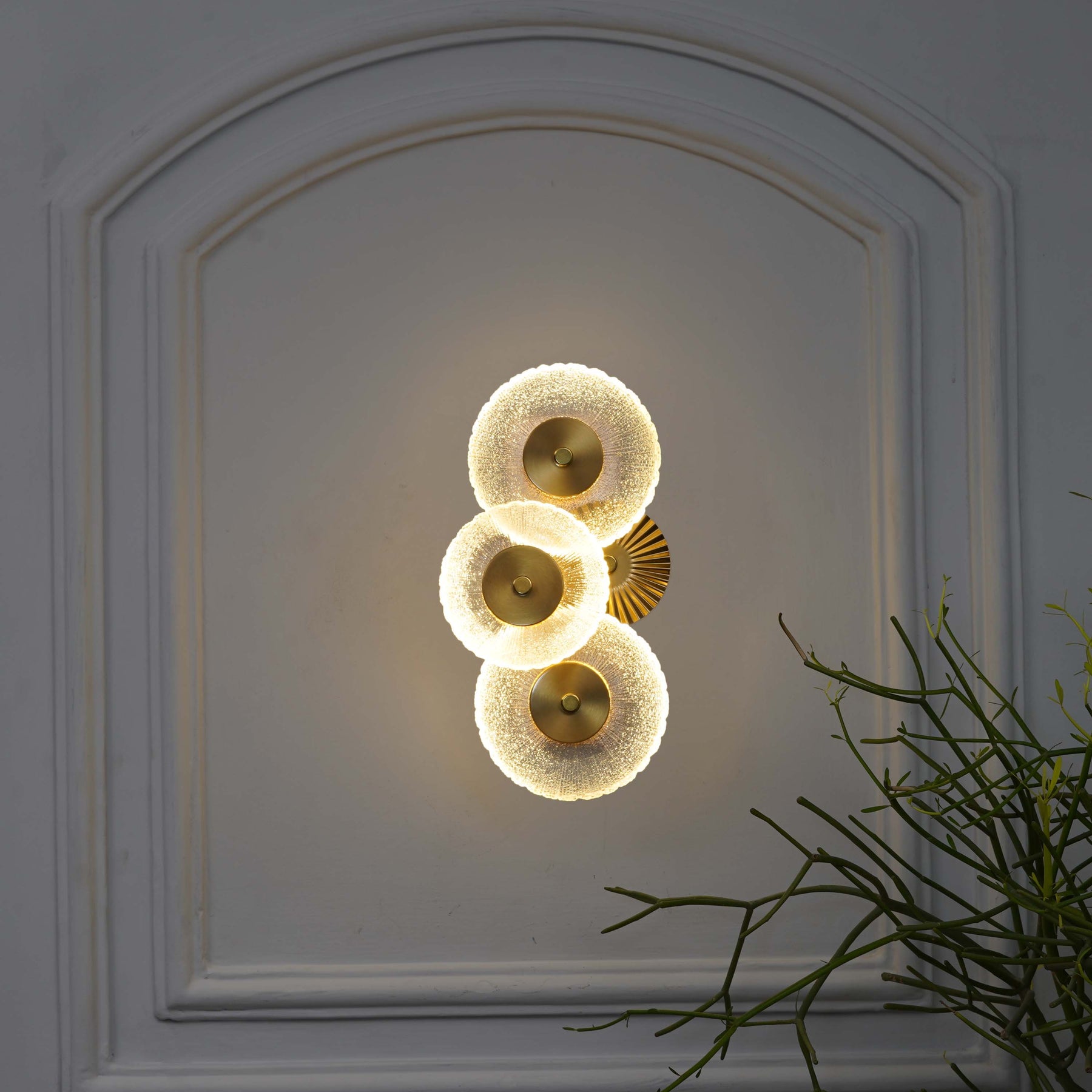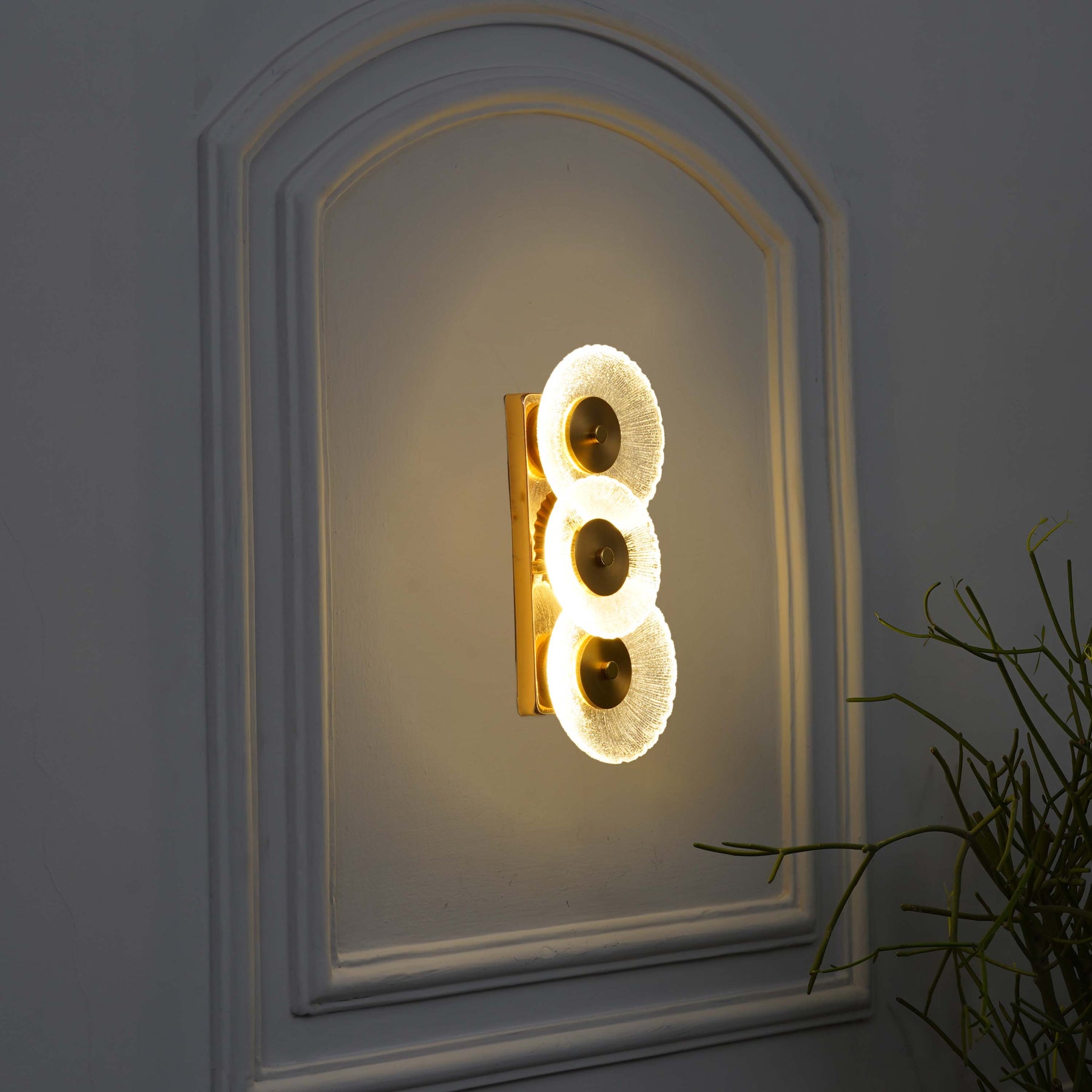 Bring a touch of understated elegance to your interiors with the ZEN Integrated 3-Light LED Wall Fitting. Expertly crafted from premium brass finish metal and complemented by frosted white glass shades, this fixture offers a warm, diffused glow that creates a welcoming ambience.