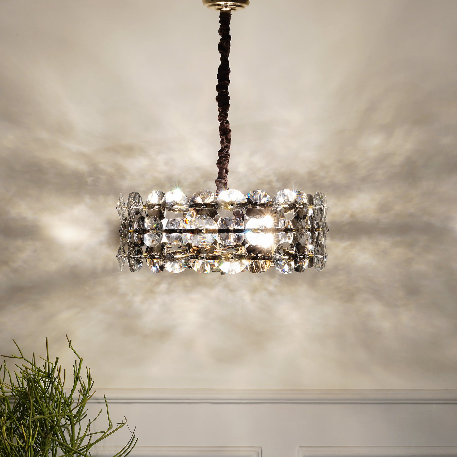 Crystal Chandelier features a dome shaped frame in clear crystal and gold circle with gold finish. This is perfect for use in a living room, dining room, island lighting or used as bedroom. The chandelier includes a chain to adjust to your home's ceiling height.