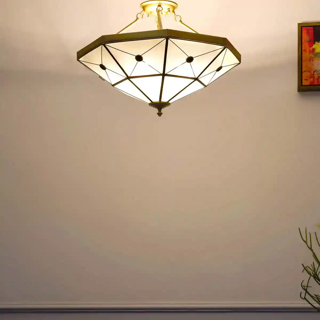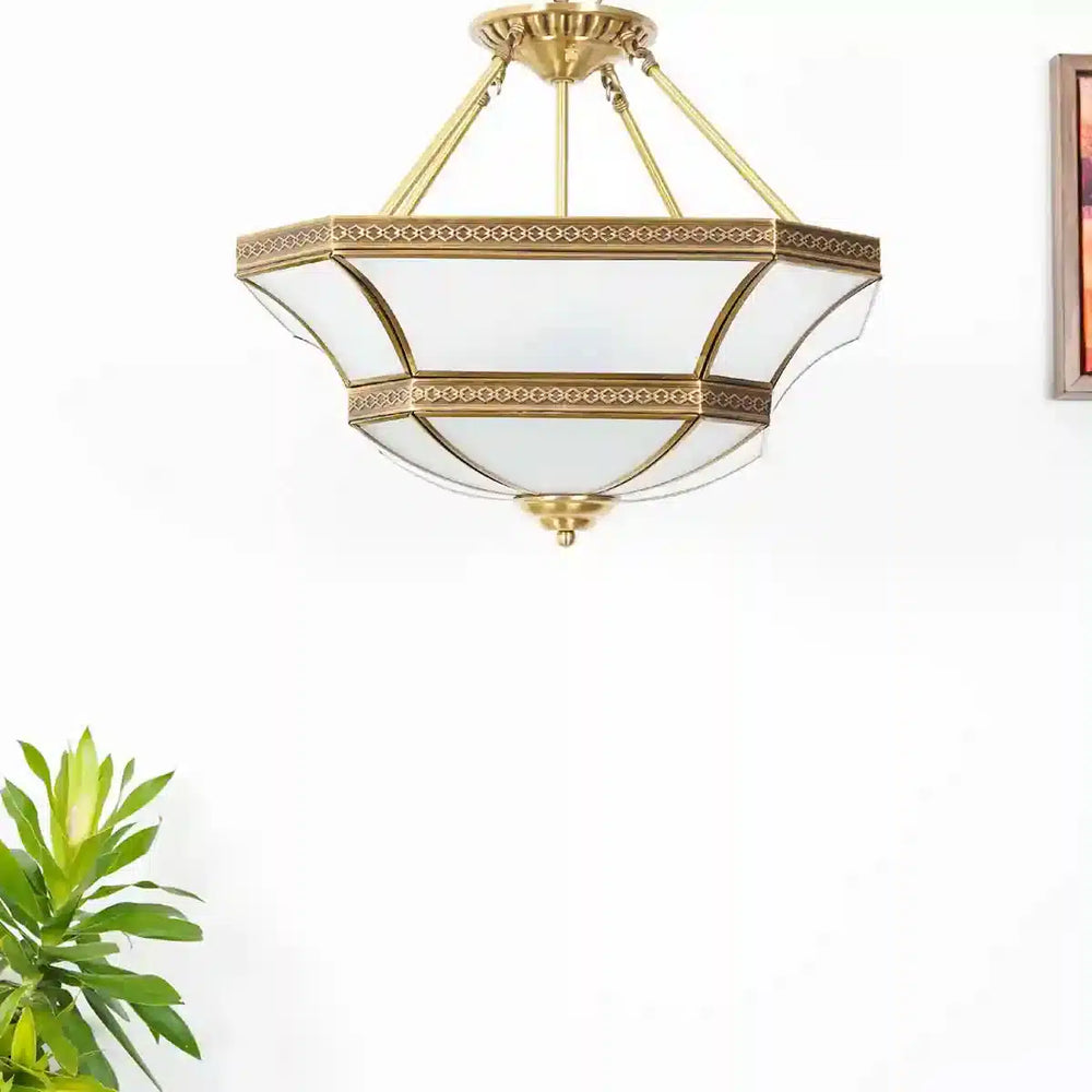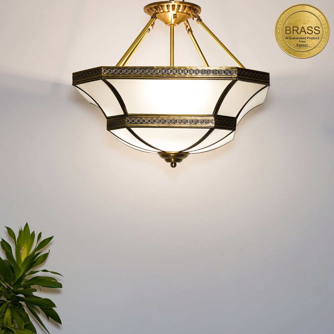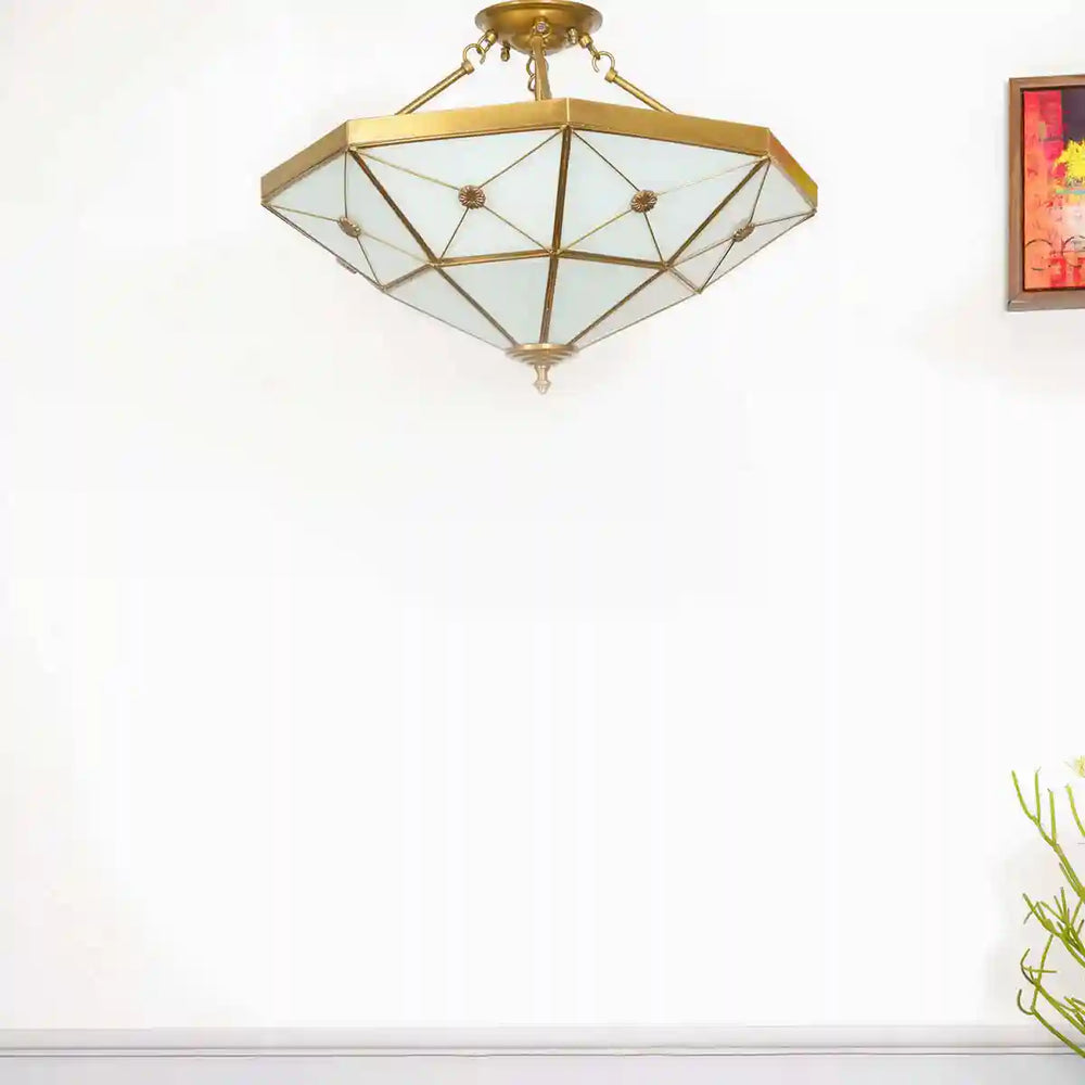 Crafted to perfection, this exquisite fixture combines striking glass panels with a sturdy brass frame for an effortlessly chic look. Radiating warm and inviting light, it creates an atmosphere that exudes professionalism and sophistication.