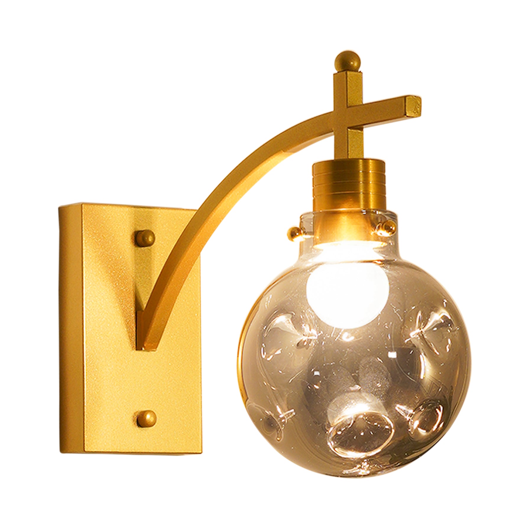 Add a modern touch and a warm glow to any corner of your home, without taking up floor space, with this one-light armed sconce. Crafted from metal & glass in a Shine Brass & Smoke finish, this fixture features a backplate and an angular arm for a streamlined look.