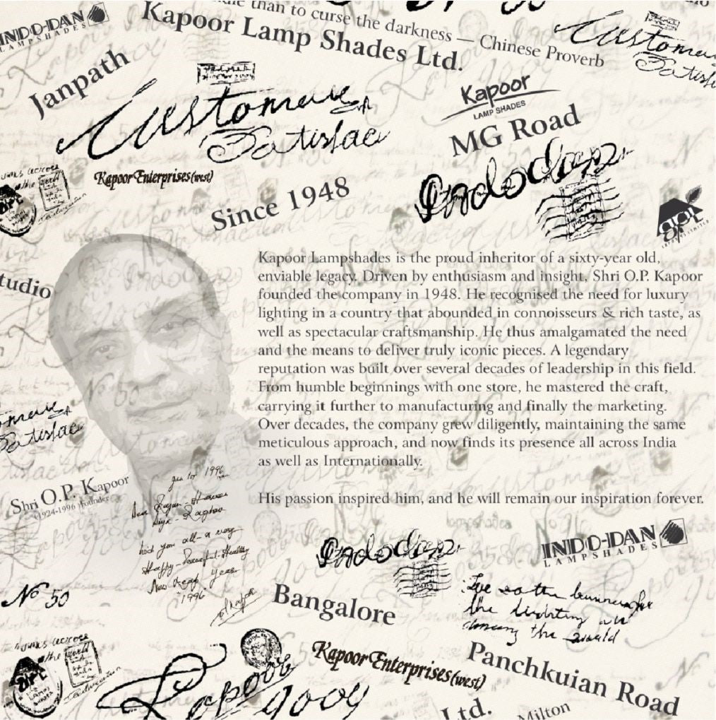 A man with a vision and on a mission was late Mr. O.P. Kapoor. Aspiring to light every space, in very special ways, he laid the foundation of Kapoor Lamp Shades in 1948.